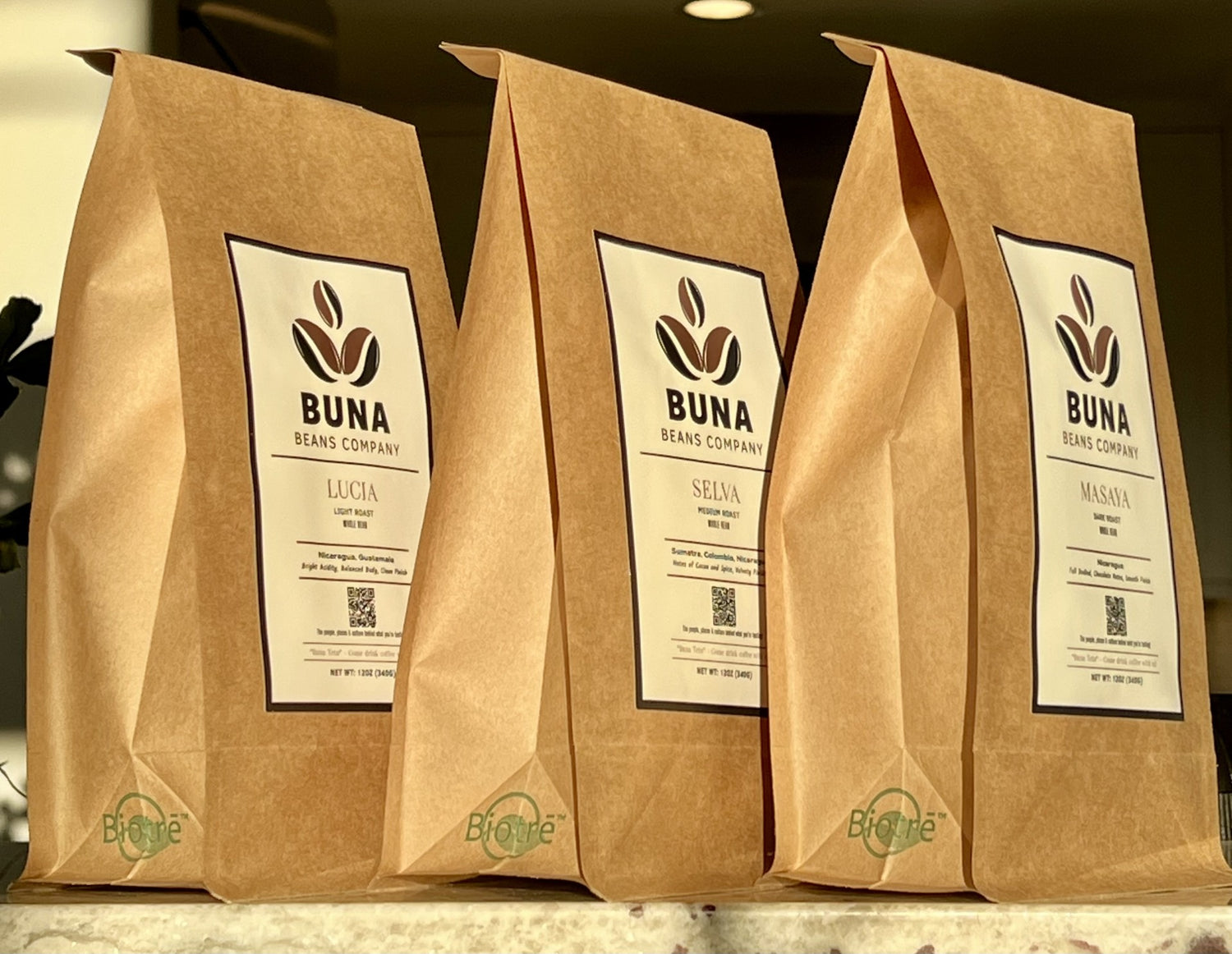 With this in mind, all of the 12oz bags utilized by Buna Beans come from the Biotrē™ product line. This innovative bag is constructed with packaging film made from plant-based, renewable, and compostable resources, including wood pulp and sugar cane.